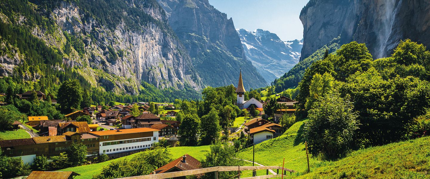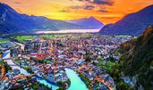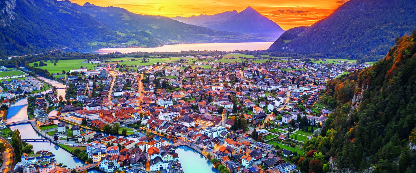 Interlaken ist ein traditioneller Urlaubsort im bergigen Berner Oberland in der Zentralschweiz. Die Stadt liegt in einem schmalen, langgezogenen Tal zwischen dem smaragdgrünen Thunersee und dem Brienzersee. Die Aare, die durch die Gemeinde fließt, wird an beiden Ufern von alten Holzhäusern und Parks gesäumt. In den umliegenden Bergen mit ihren dichten Wäldern, den Alpenwiesen und Gletschern gibt es zahlreiche Wanderwege und Skipisten.
